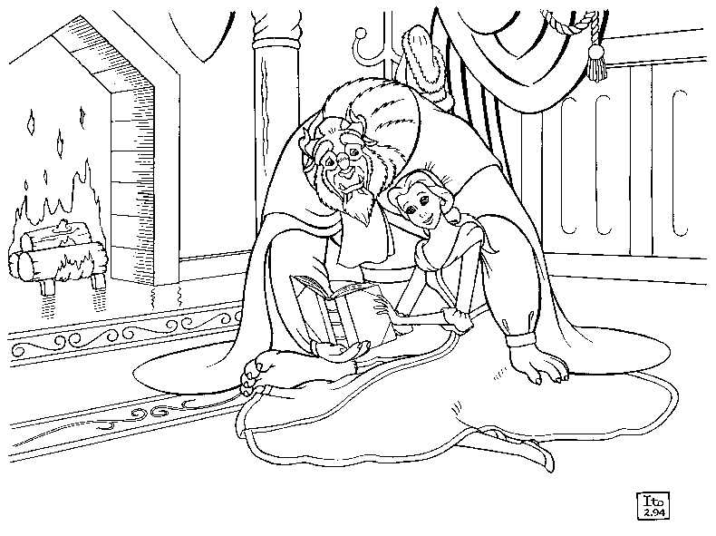 One of the most romantic scenes in the Disney movie BEAUTY AND THE BEAST is the fireplace scene, where Belle and Beast enjoy a moment reading together by the warmth of the hearth after playing in the snow. It is here, where the song "Something There" concludes, that the two begin to acknowledge the love blossoming between them. This image celebrates these growing bonds and depicts a hypothetical scene after the end of the song, in which the two get more comfortable as they read. Belle is snuggling up to the warmth of Beast's side, while he looks on fondly upon her. You can almost hear his thoughts of love going through his mind....