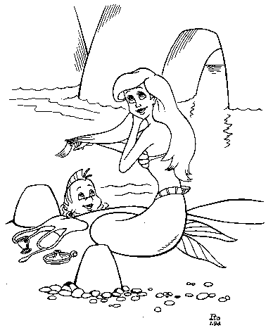 _A (Disney) Mermaid_ (388x476x2, 6122 bytes) is one of his most delicate conceptions, and understandably he has lingered long in bringing it to perfection...The mermaid combs her hair while the small waves turn endlessly behind her and her finned friend on the sea-margin and the massive rocks. As always, Ito is able to capture the natural moment of stillness; the dinglehopper pressed to the end of the auburn tress, the parted lips and dreaming eyes speaking of princes on land far away, the cup she stole from another Disney movie...--Amberle Ferrian, R. ITO, FDC Press, 1994, on the knockoff drawing _A (Disney) Mermaid_ (1994) by Ito (19??- )