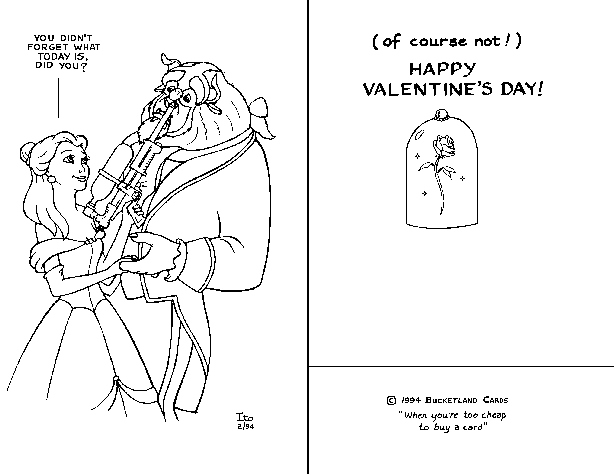 bbvalent.gif (614x474x2, 9005 bytes) depicts Belle, of Disney's BEAUTY AND THE BEAST, "reminding" Beast of Valentine's Day literally at gunpoint. :-) This is actually a Valentine's Day card drawn by Bob and signed by the four Bucketeer Bodyguards: Bob, David Cuthbert, David Uy, and Jeff Wilson. I've scanned both the front and back covers and the inside "greetings" in hopes that you'll get as big a laugh out of it as the five of us did. :-) All personal messages have been deleted; you don't need to see that. ;-)