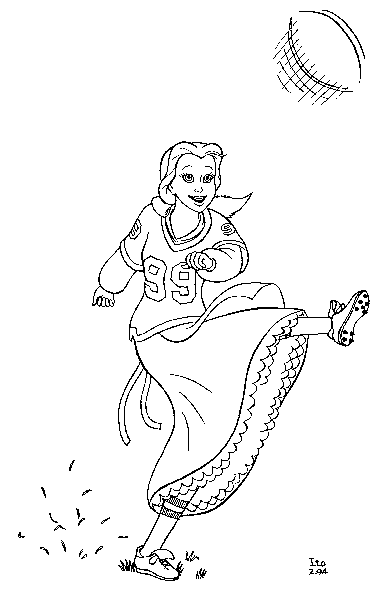"Belle a Bill!" (391x595x2, 6440 bytes) is sort of a sequel drawing, if drawings could have sequels like movies. :-) One of Bob's earlier drawings, "Belle at Bat" (bellebat.gif) was inspired by a whimsical "news flash" post to rec.arts.disney that Bob wrote about Belle getting drafted by the Los Angeles Dodgers professional baseball team. Jeff Wilson <jdwilson@[...]> wrote a followup "scoop" claiming that Belle subsequently deserted the Dodgers to play American-rules football for the NFL's Buffalo Bills. Bob is not one to let a good idea go unexploited, so here's Disney's heroine showing what she can do on the gridiron. :-)