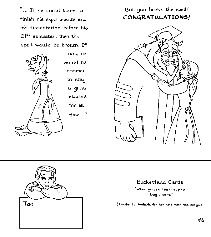 ...But, like the Beast, some grad students eventually break their spells as the years pass, and graduate! And so it was for rec.arts.disney's Future Disney Cabinet (FDC) walkaround Beast, Jeff Wilson <jdwilson@[...]>, who successfully defended his Ph.D. dissertation in theoretical chemistry on 11 May 1994. And in recognition of this achievement, a number of his net. peers on r.a.d have gotten together to take a "picture" of Beast at his commencement ceremony, in full academic regalia, with Belle proudly adjusting his doctoral hood.