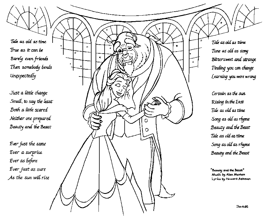 The romance and love between Belle and Beast is captured poignantly in this beautiful drawing, set to the lyrics from the title song.