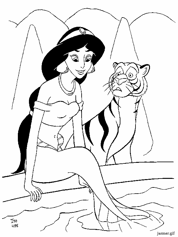On request of an admirer of Bob's work (whose name Bob, alas, has forgotten), we now have a new "what if" image: "What if Jasmine were a mermaid?" In this picture, we see Jasmine, whose lower half has been transformed by the magic of Bob's pen, as a mermaid playfully dipping her fins in a pool of water. Jasmine's pet and bodyguard, Rajah, looks on with a bit of concern.