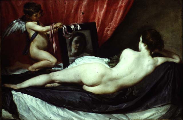 [This is] a picture of Belle, which is a spoof of the following painting, Diego Valezquez's "Venus at her Mirror" (aka "The Toilet of Venus" and "The Rokeby Venus"). I actually got the idea from Ward Kimball's "Art Afterpieces," where he had his own version of Velazquez's painting (and a number of others), and it was too good to pass up. :-)