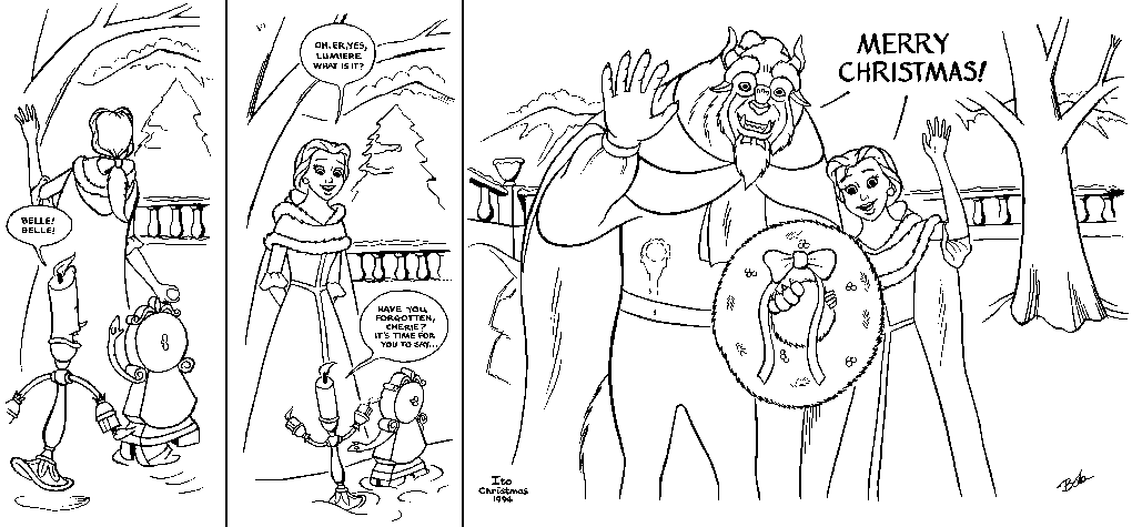 "A Beauty and the Beast Christmas" (batbxmas.gif, 1020x475x2, 24297 bytes) is the 29th in a continuing series of fine Disney fanart drawings by Bob Ito <ito@[...]> and the 8th in the so-called "Bucketland Cards" series of handmade greeting cards, "when you're too cheap to buy a card". :-)